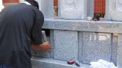 ④石材店の方から目張りをして蓋を閉じていただきます。蓋には戒名が彫られています。